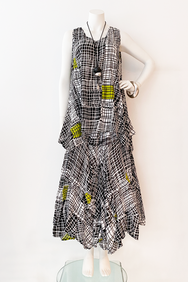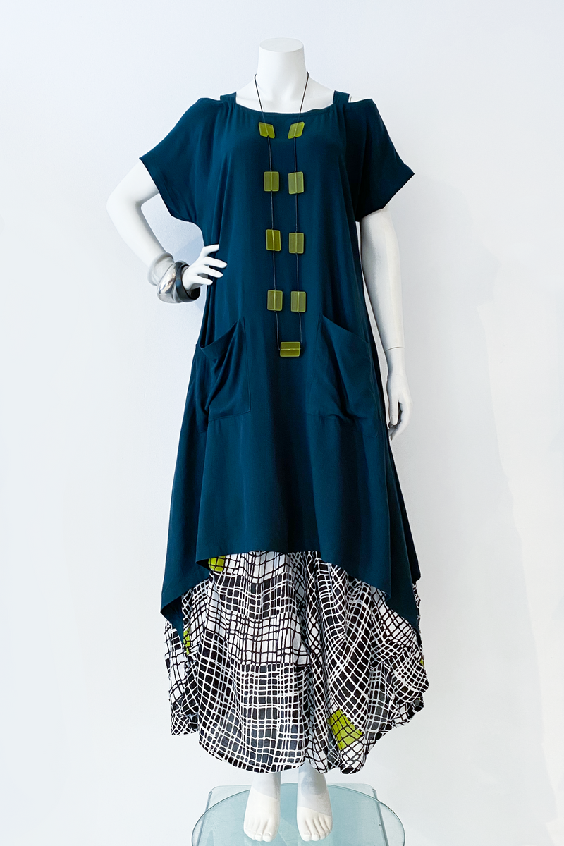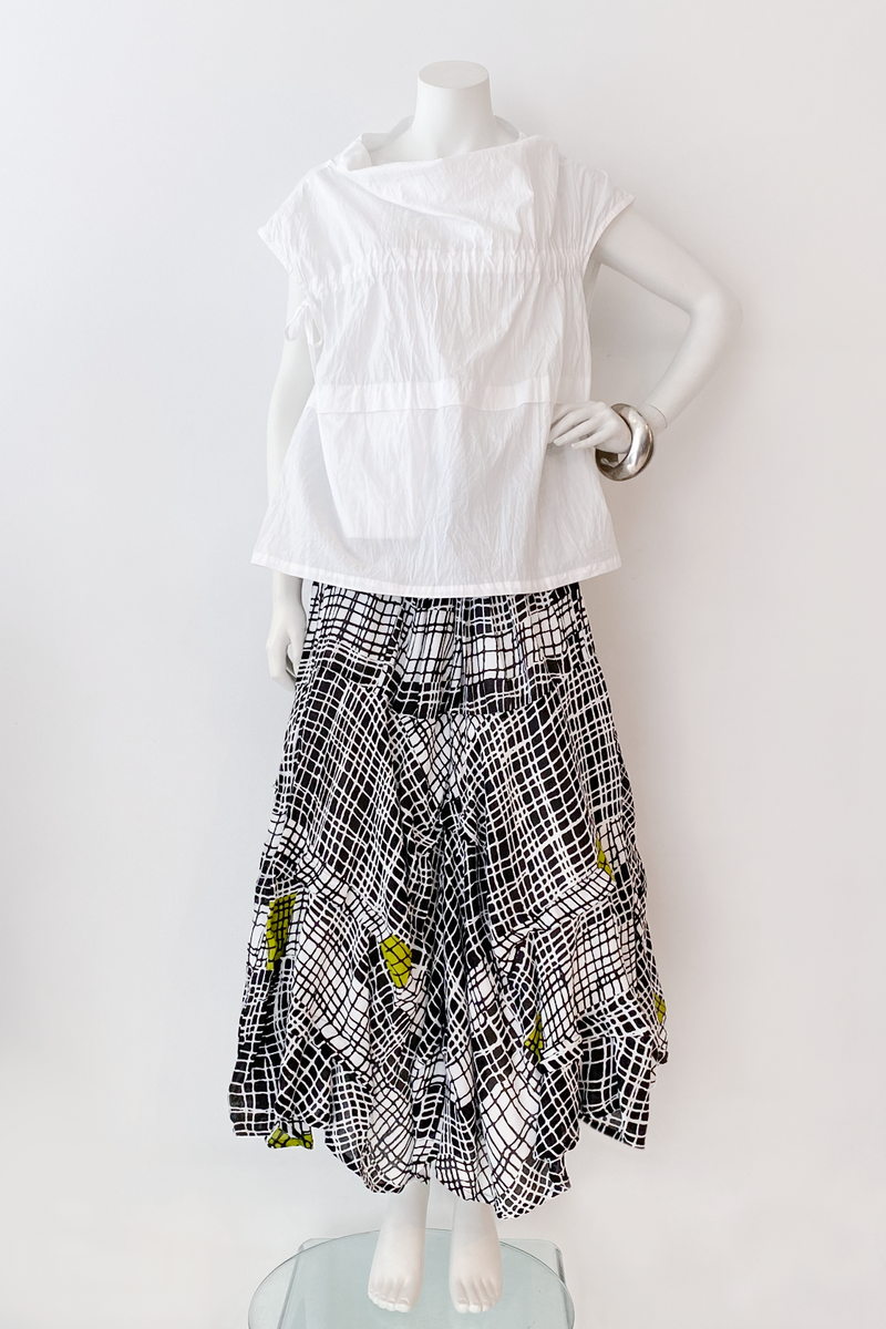 Our all-time-favourite skirt! This incredible A-line shape with folds here and there is a soft sculpture that is as easy to wear as it is to look at! Undulating uneven hemline with elastic waistband and side-seam pockets.