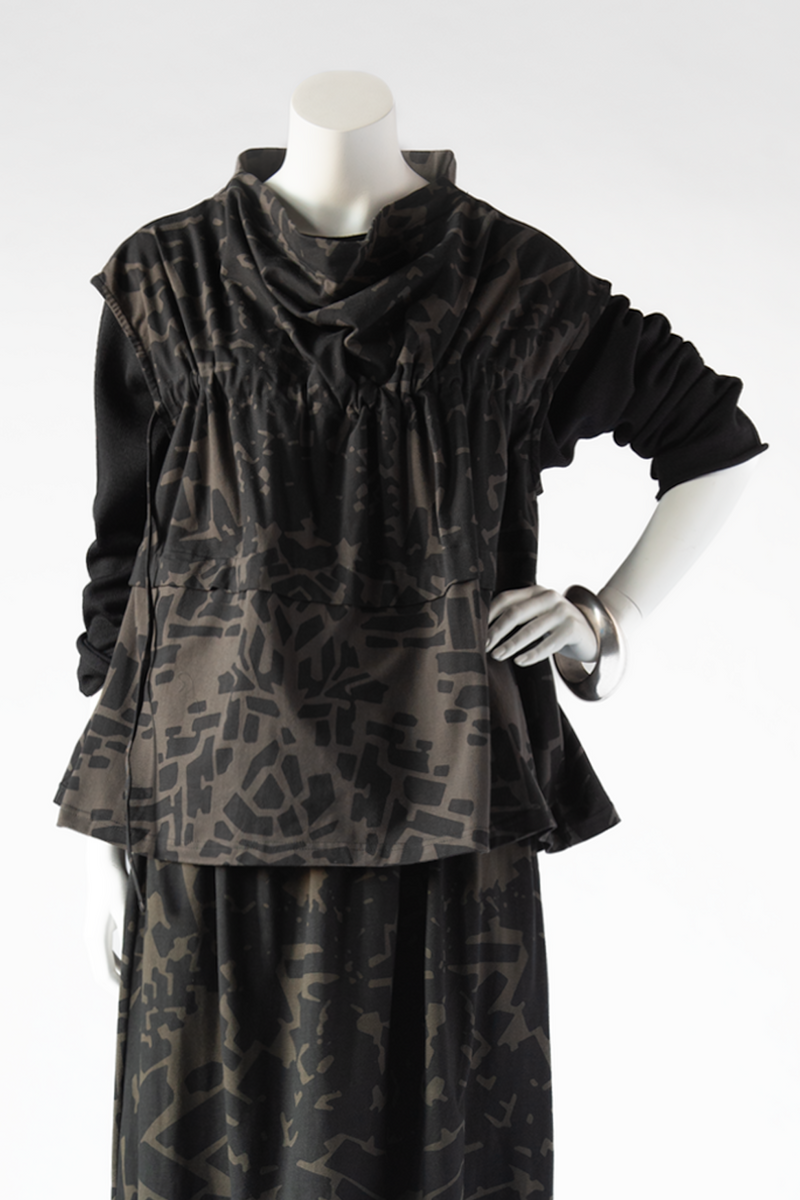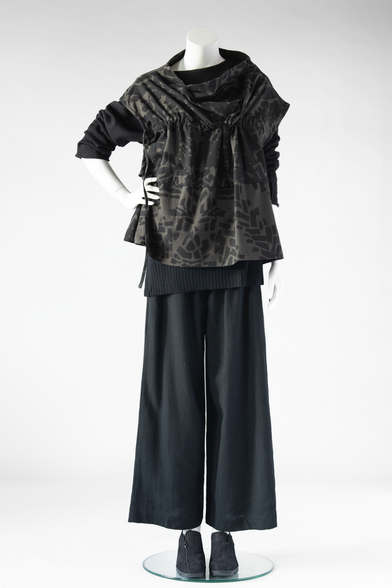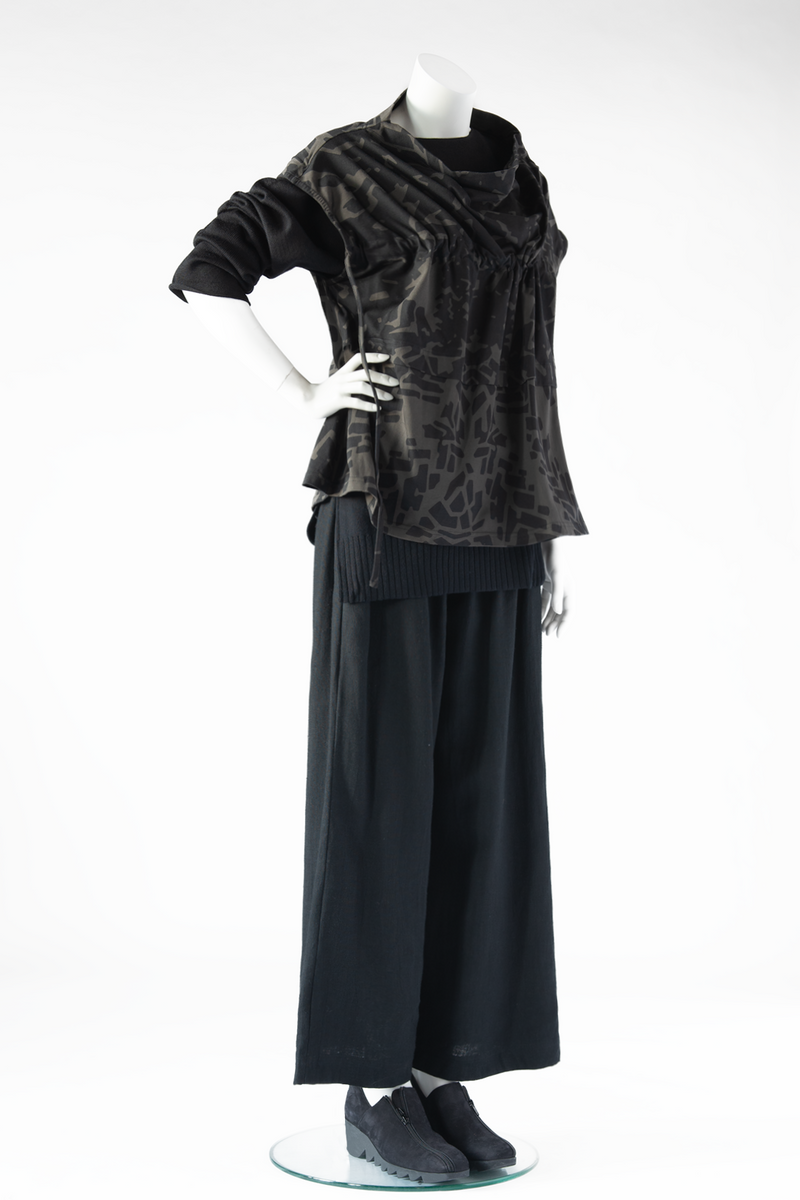 • An avant-garde boxy top with a drawstring across the chest that can be used to vary the silhouette. Has cap sleeves, fold detail across front, and draped neck. Accessories not included.