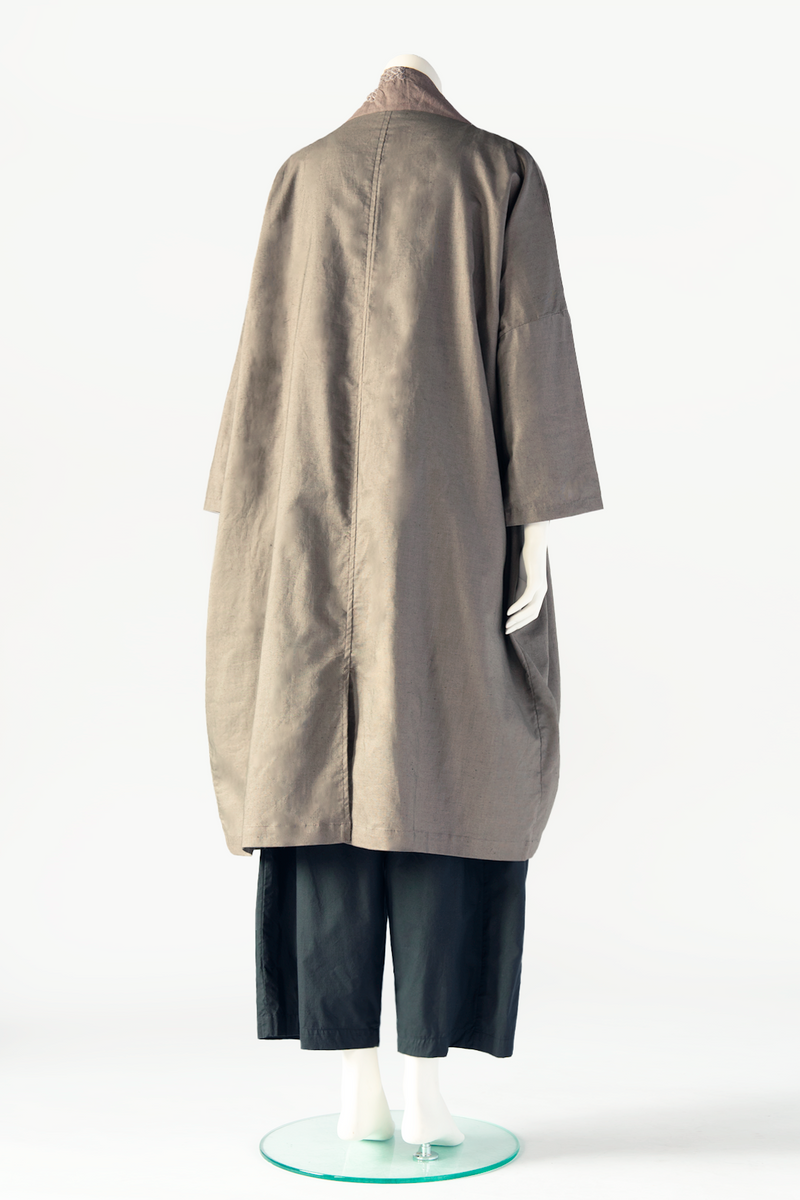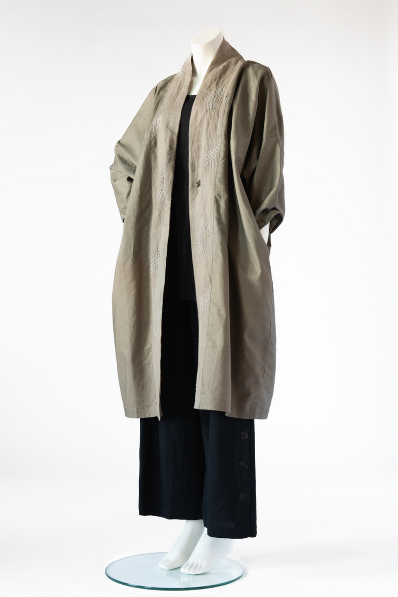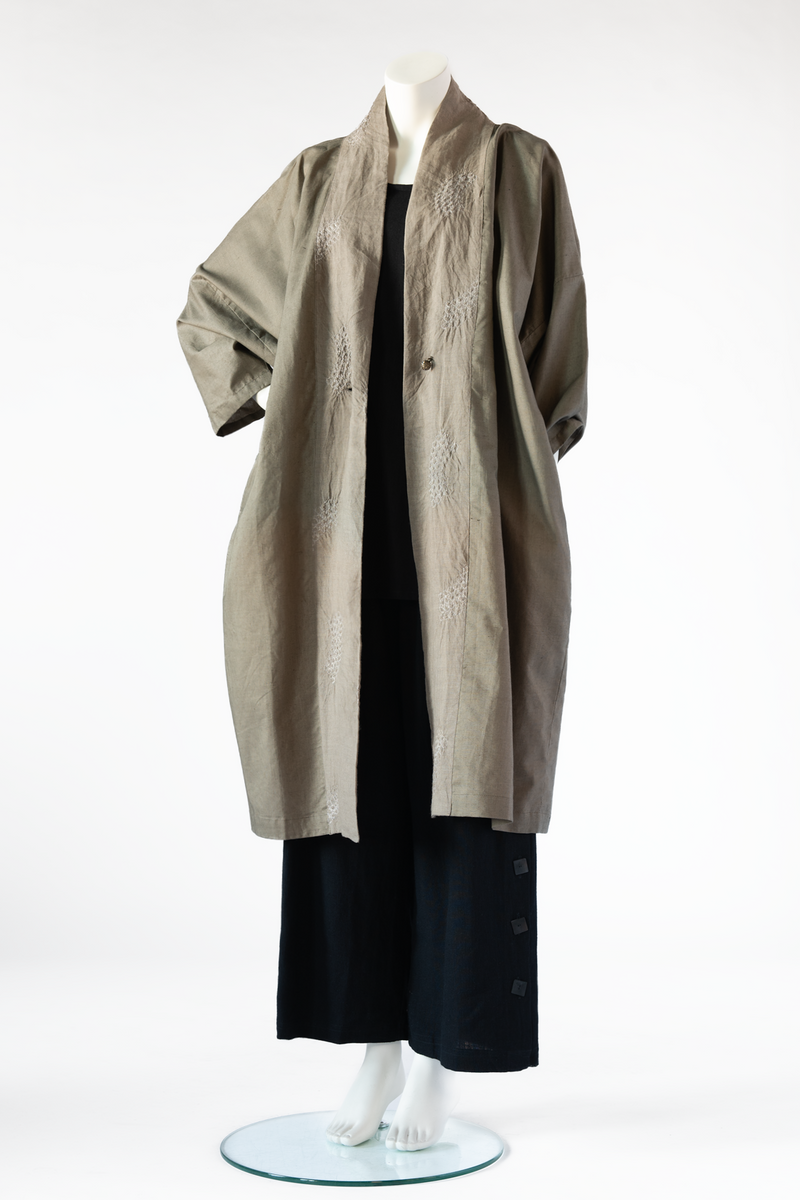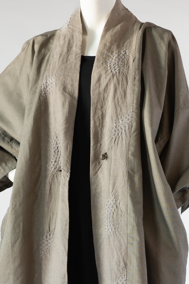 The shibori print around the collar and center panel is what makes this piece so unique. Great kimono-style layering piece! Wear it open or fasten with single button closure. Side Pockets. Accessories not included.