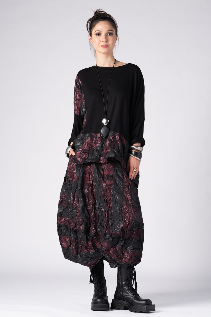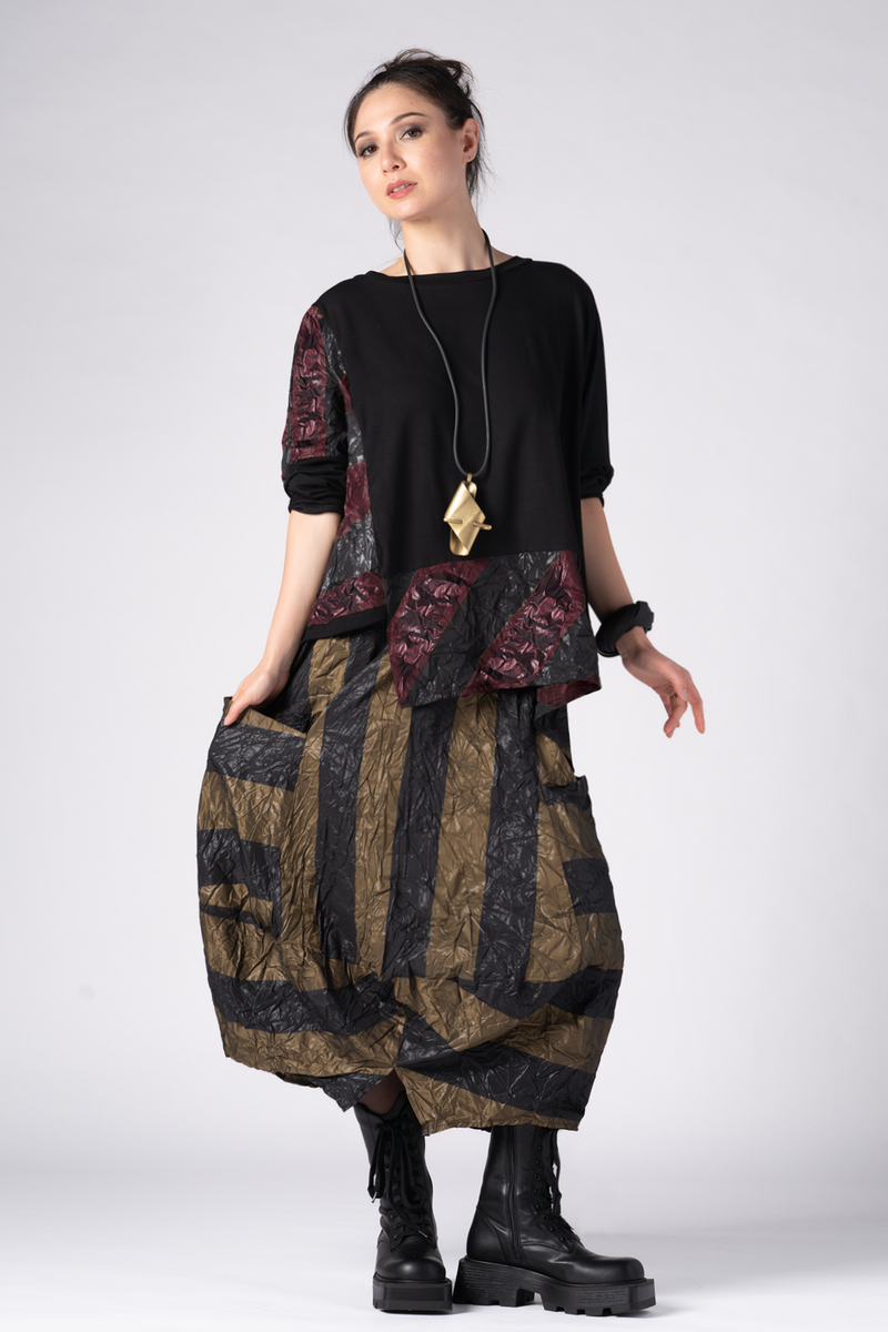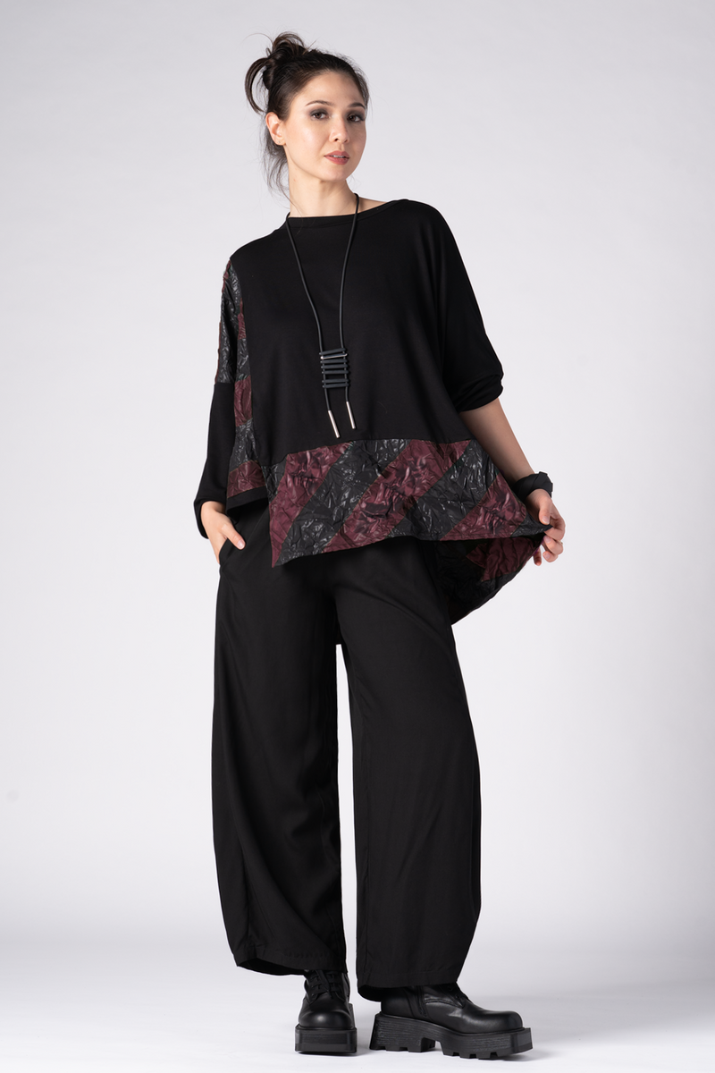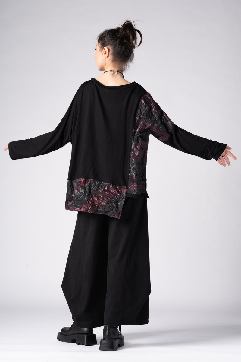 A cutting-edge long sleeve top. Soft jersey body paired with techno-satin, crushed texture stripe panels. A squared side-cutout creates a relaxed, asymmetrical hem for an effortlessly modern look. Accessories not included.