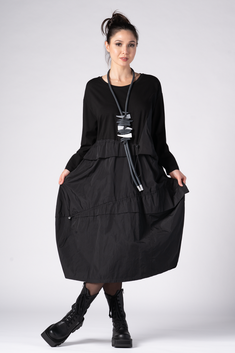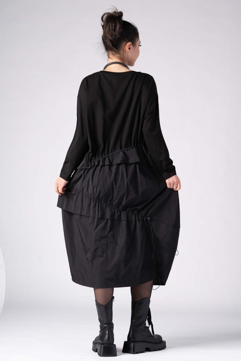 • This dress combines avant-garde style with effortless comfort and fit. Soft jersey body and a structured, sculptable skirt in cutting-edge techno fabric. Elasticized ruching strings emphasize shape and texture for the most fabulous dress ever! Side pockets.